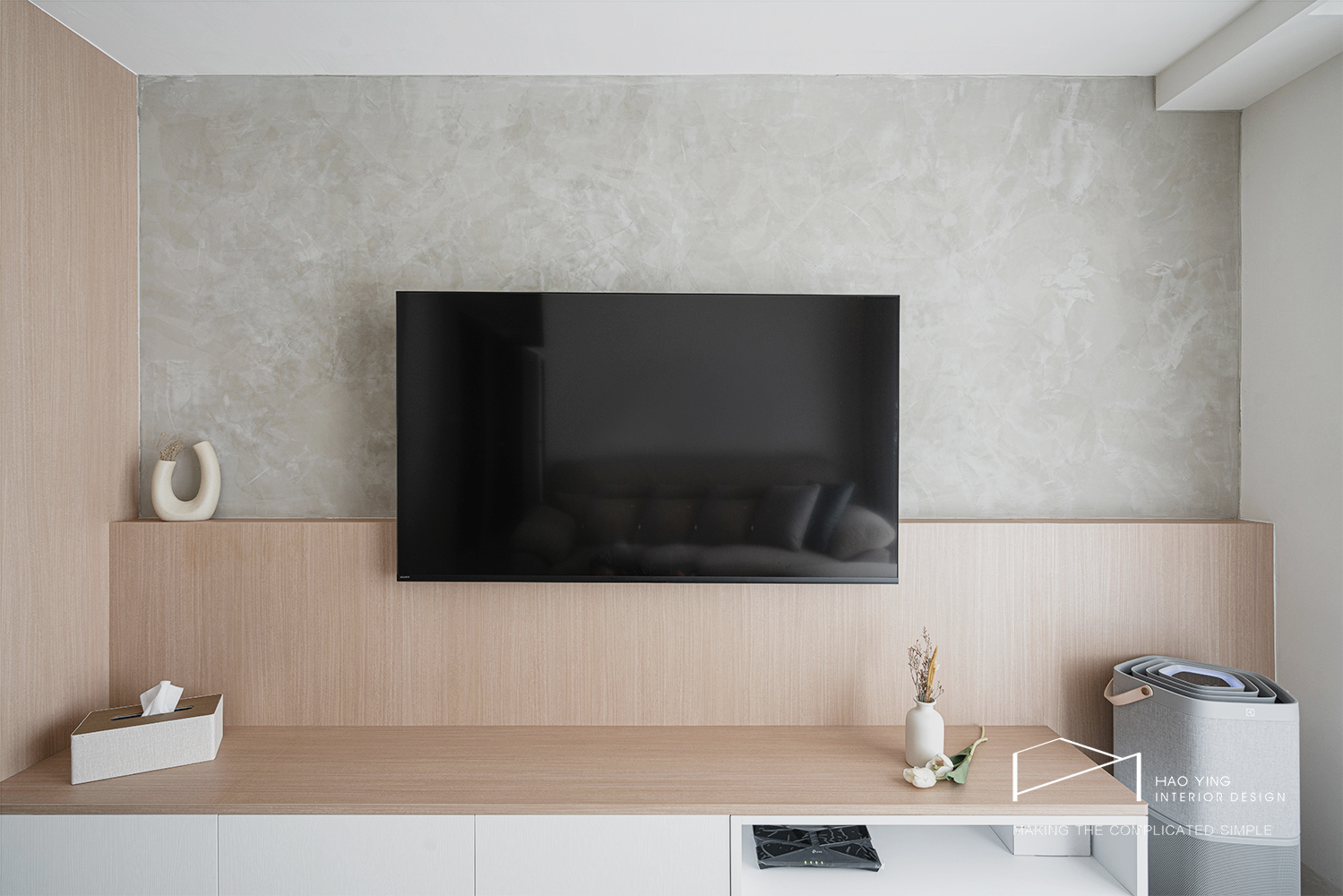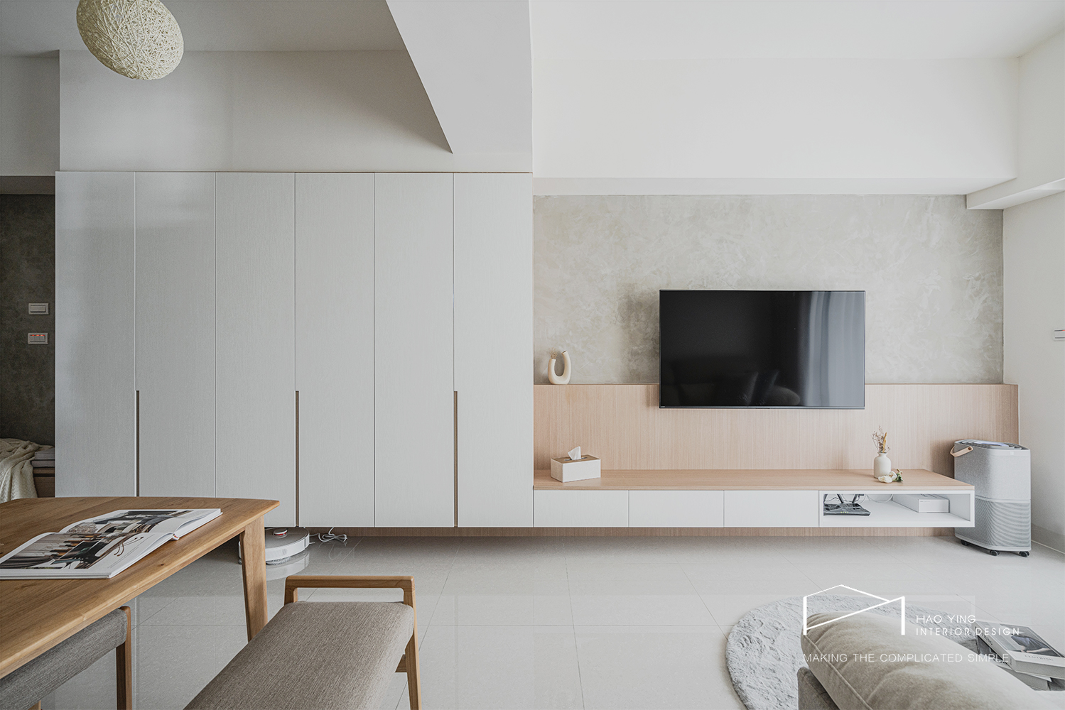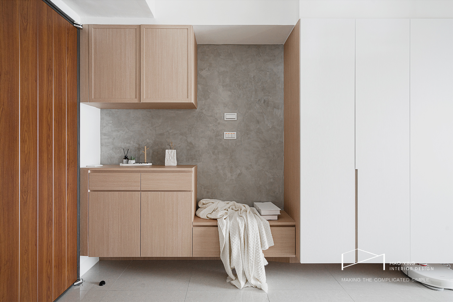 木紋櫃體拉出一道溫序,灰質手抹牆收住進門的情緒