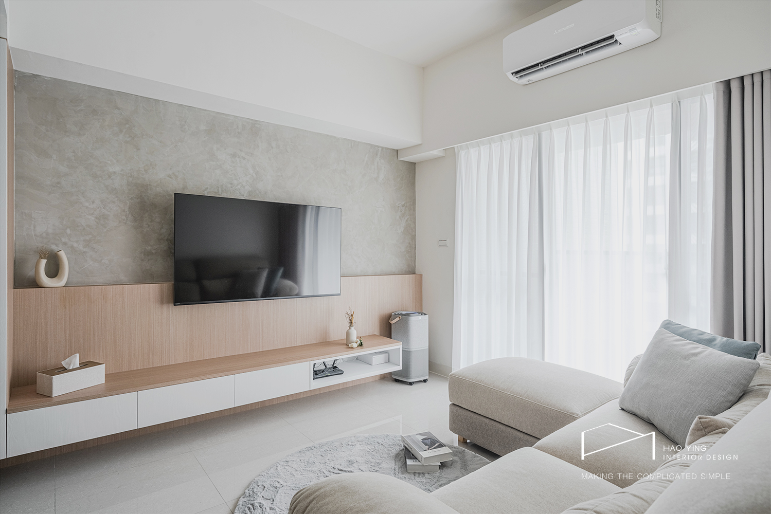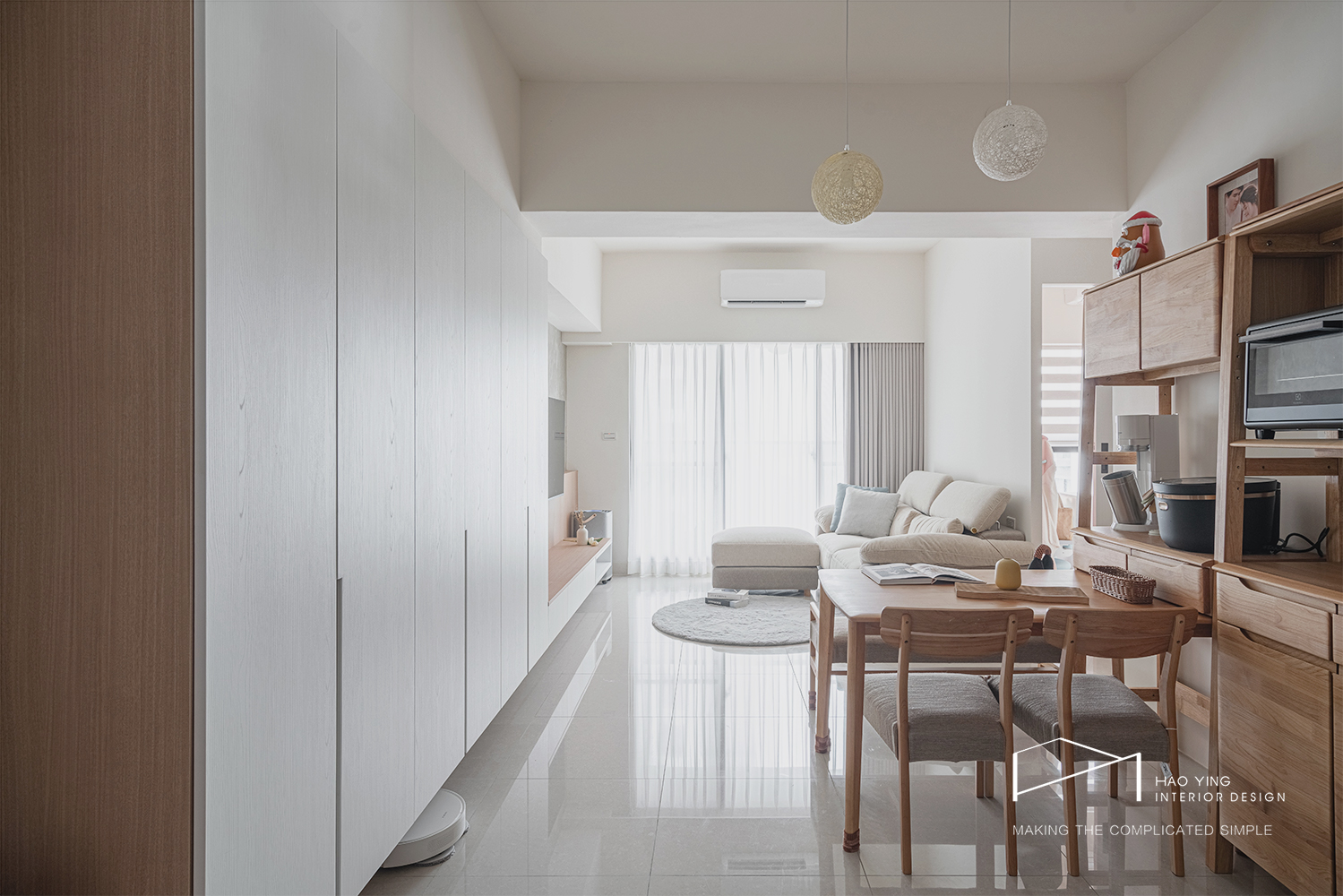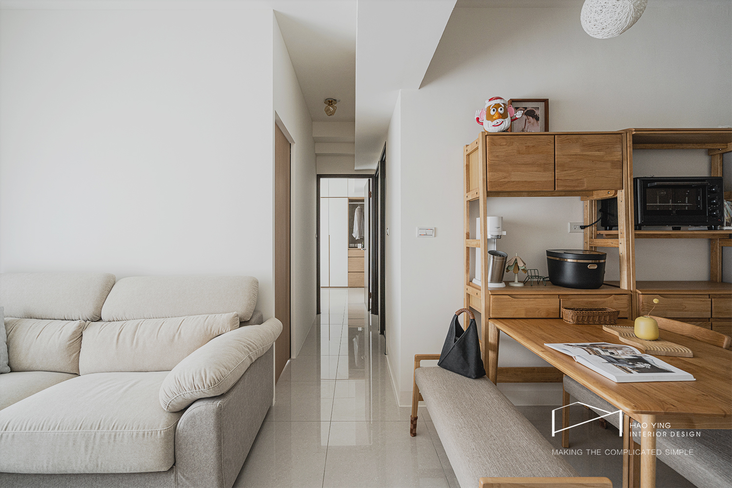 木紋櫃體拉出一道溫序,灰質手抹牆收住進門的情緒