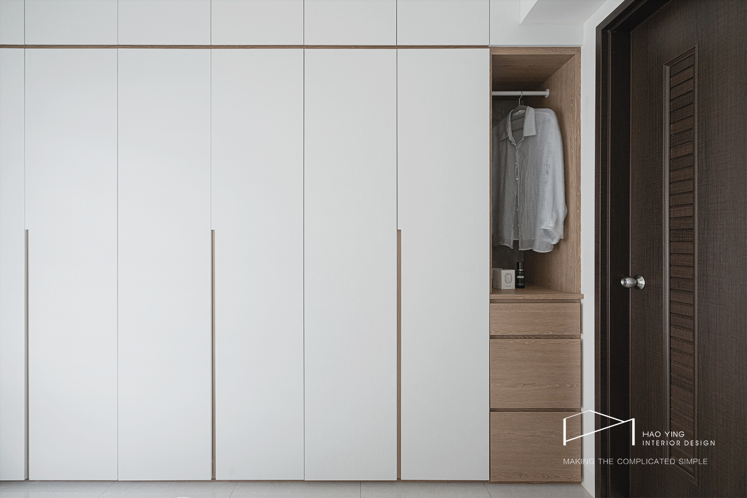 純白衣櫃以隱藏把手維持俐落,側邊開放格成為日常取物的貼心節點