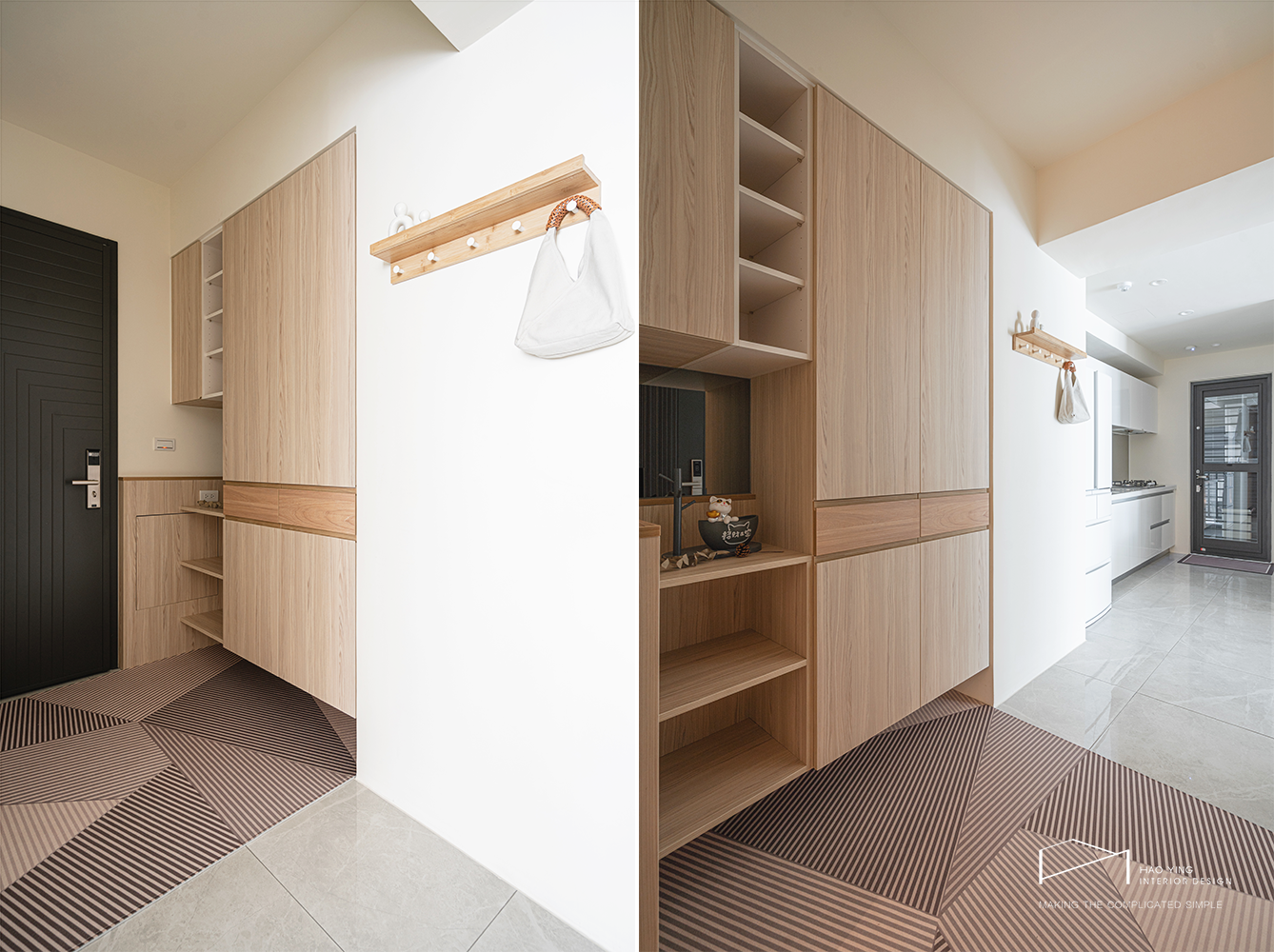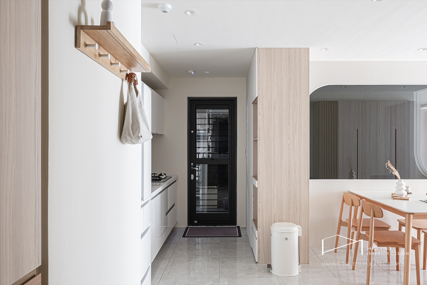 幾何落塵墊界定進退節奏,視線沿廊道銜接明亮餐廚