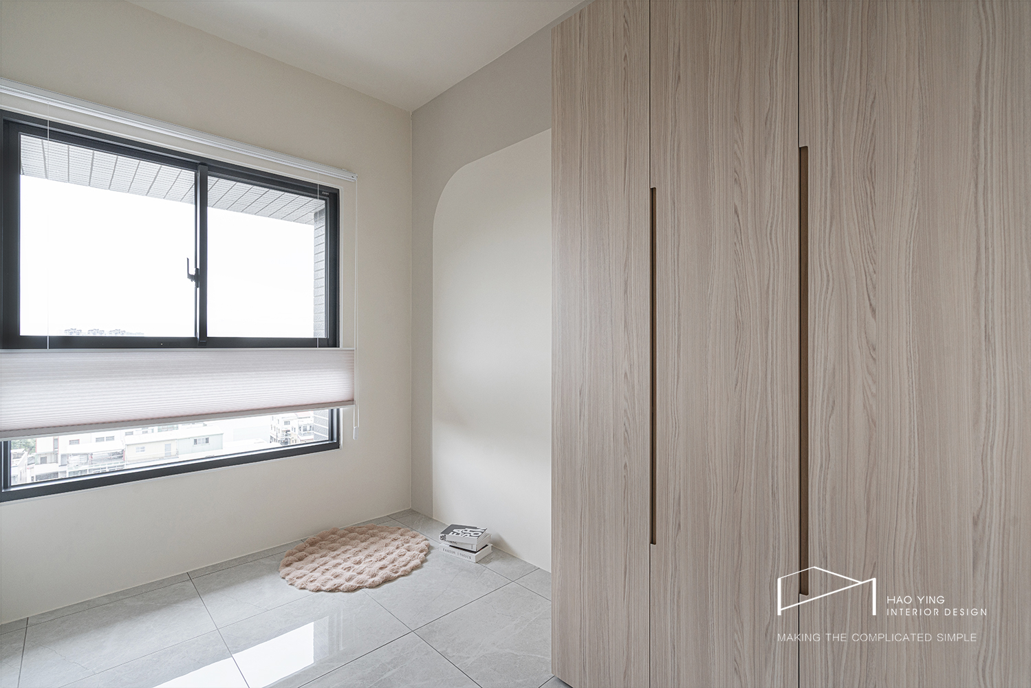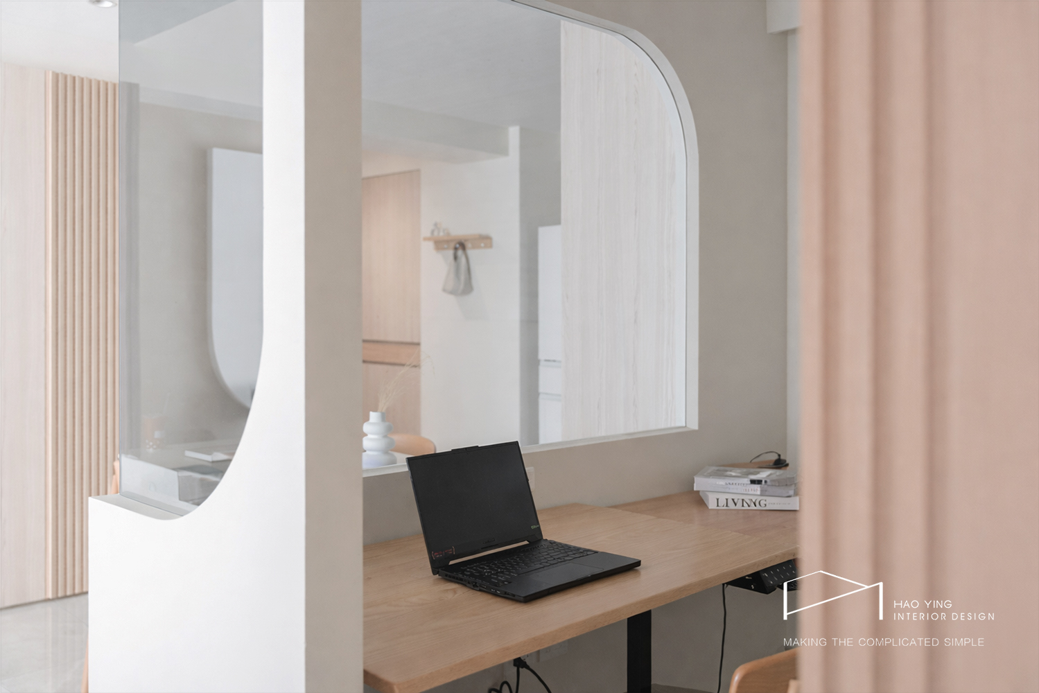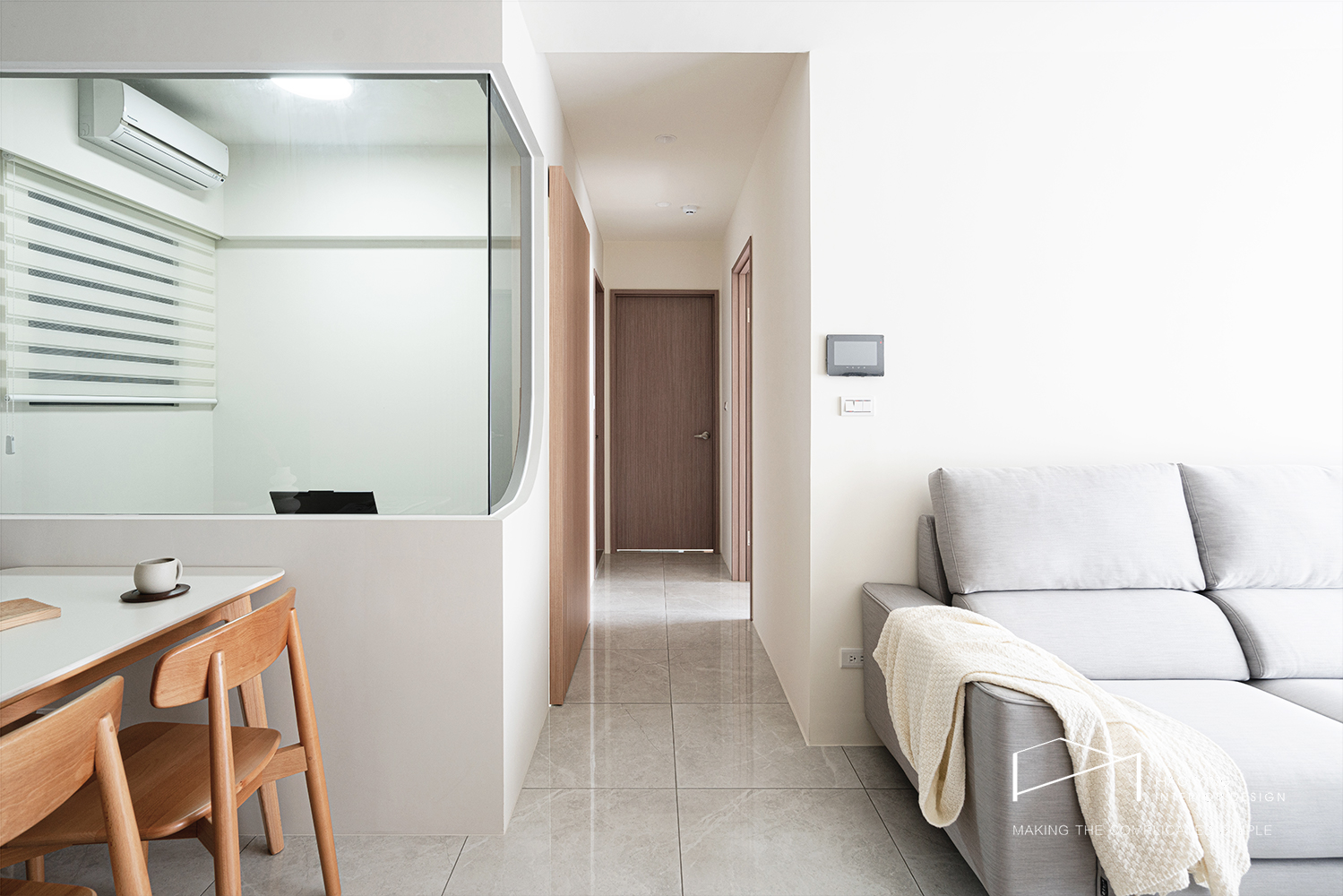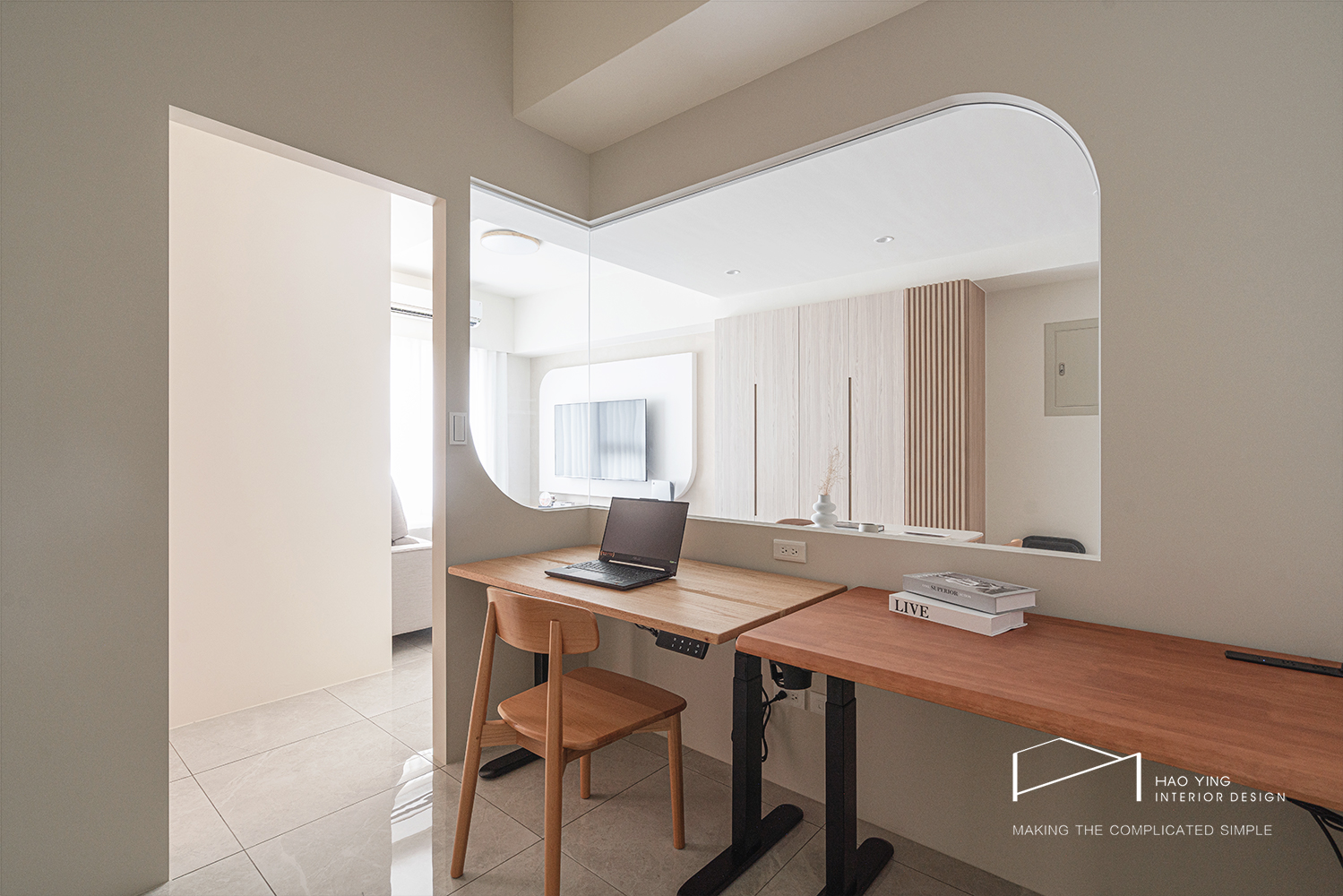 室內窗串聯餐廳與書房,圓弧收邊柔化轉折,視線與光互借