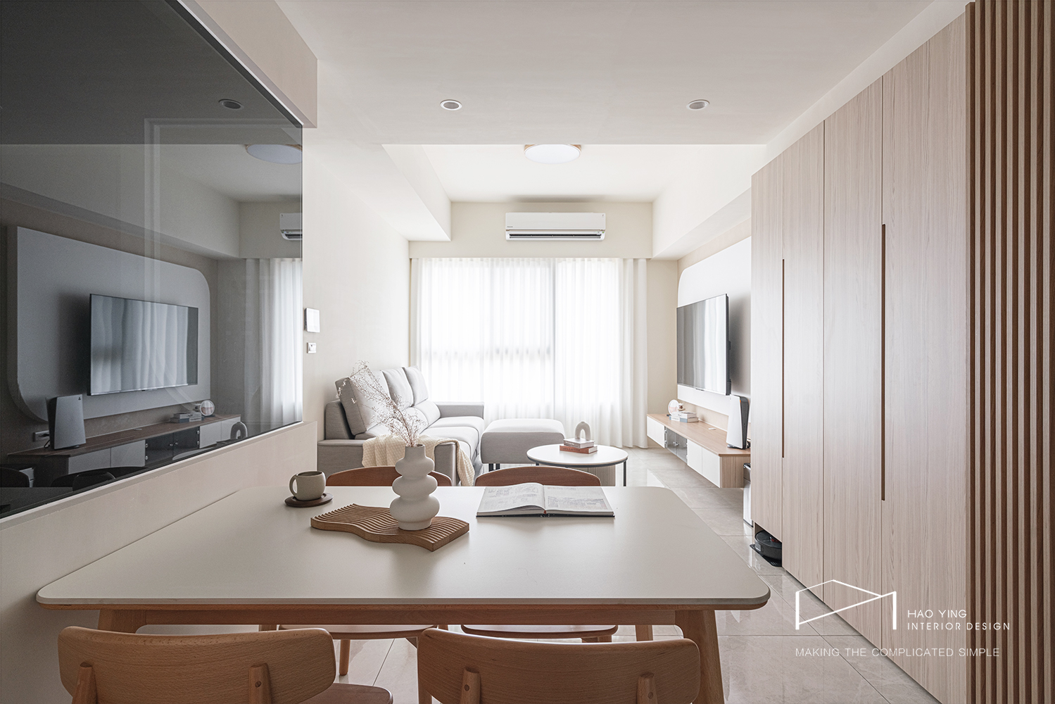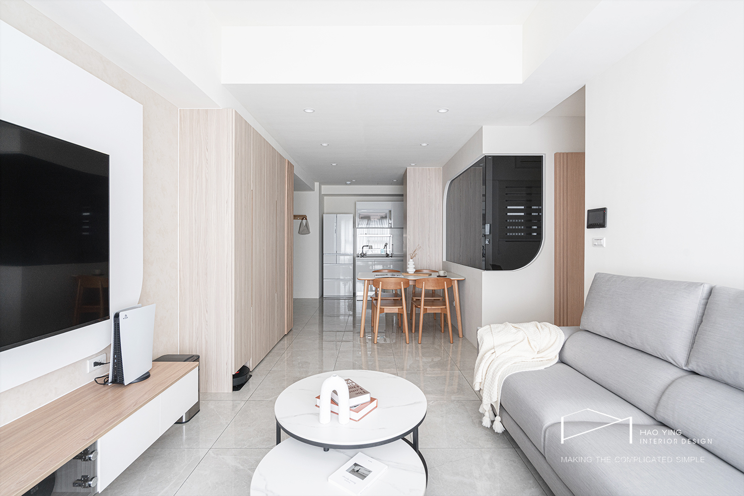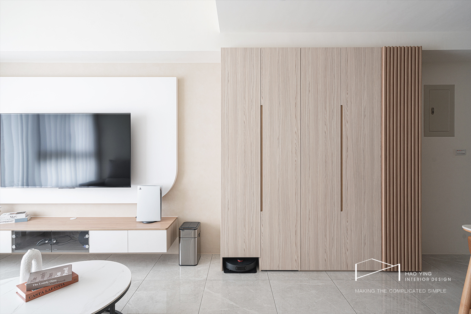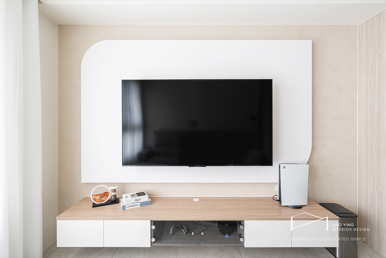 圓角電視牆收束量體,木質視聽櫃拉出水平