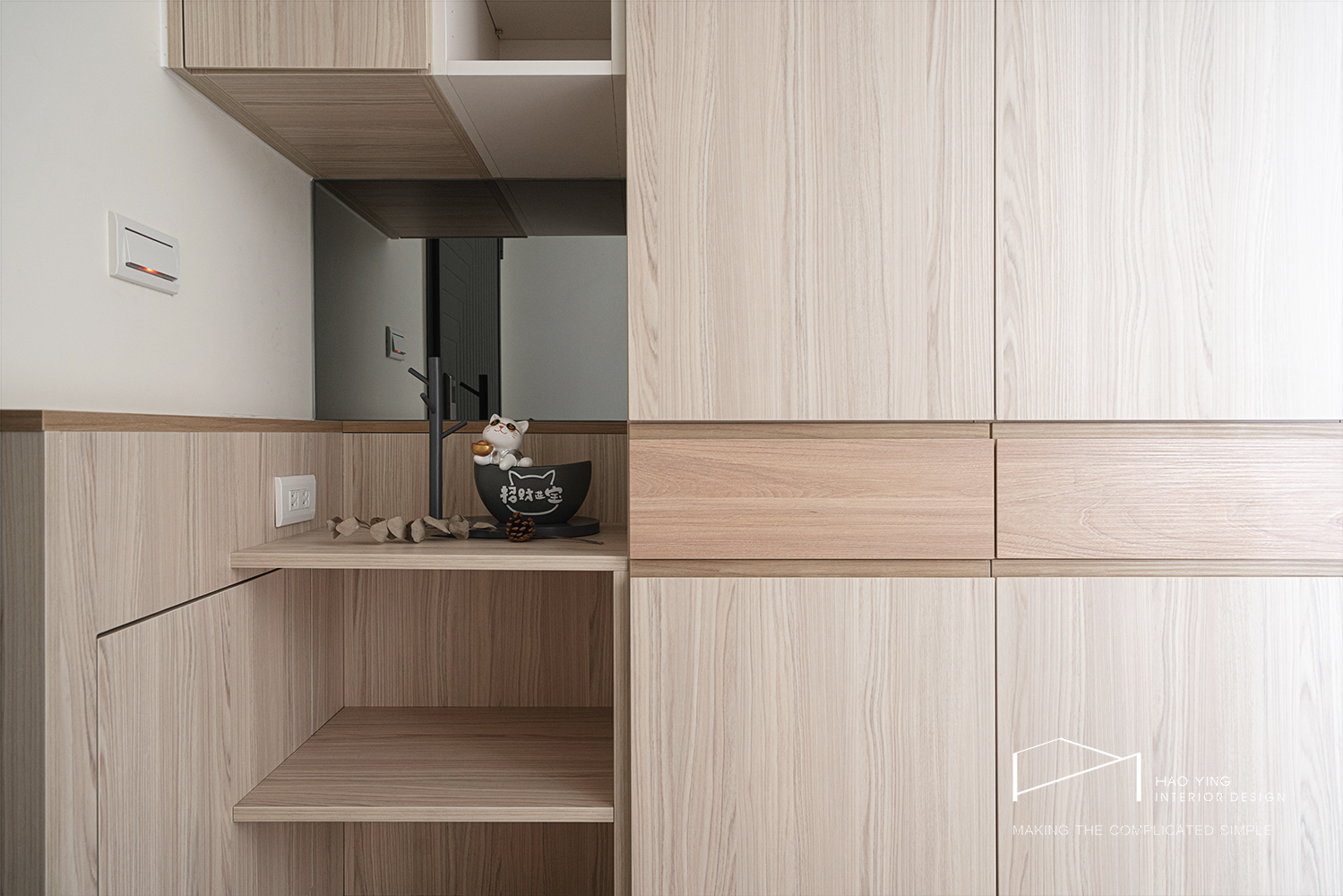淺木玄關櫃以無把手立面延展,懸空落地清掃更輕鬆
