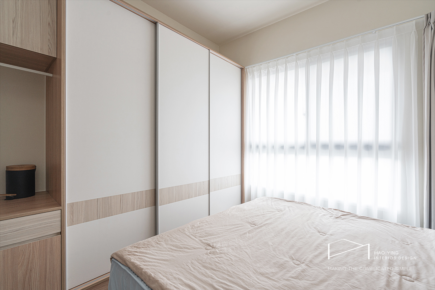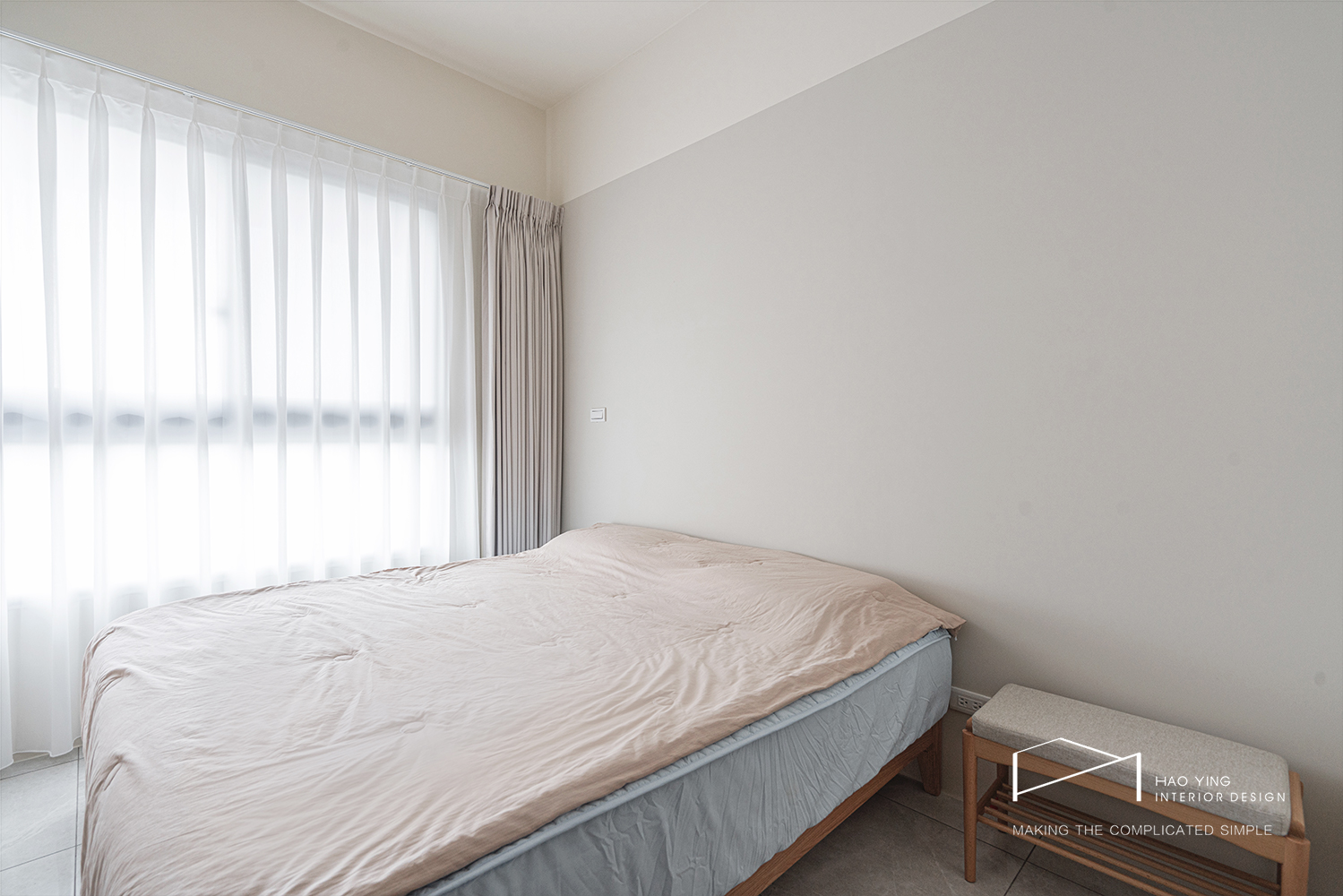 臥室以透光紗簾過濾日照,留白牆面讓睡眠視覺安定