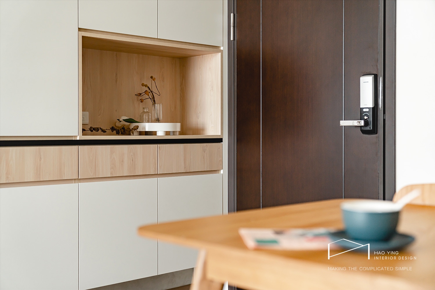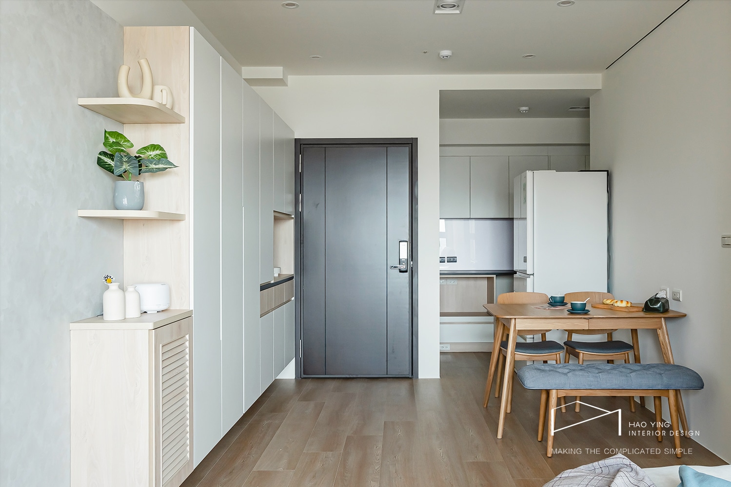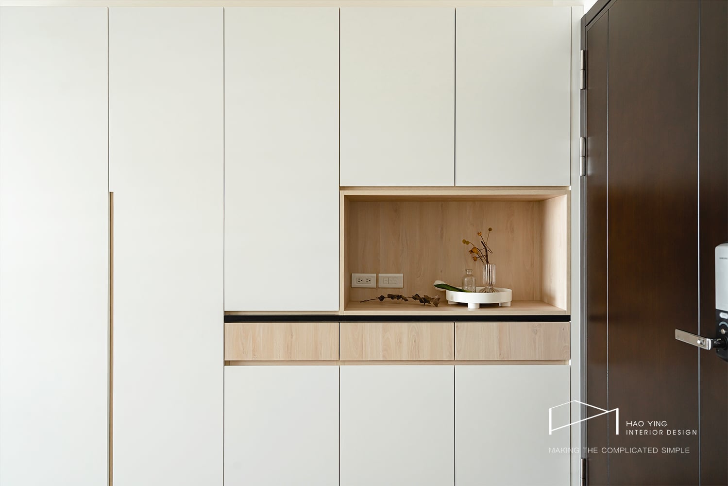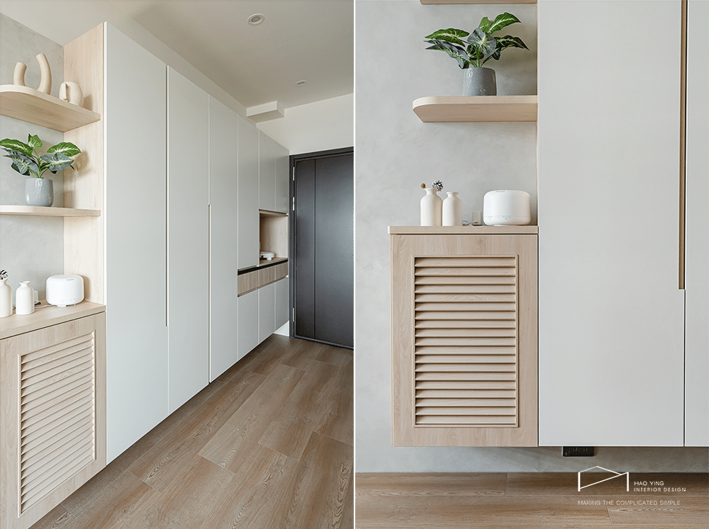 大面櫃體以純淨立面延展,讓入口更顯俐落雅緻