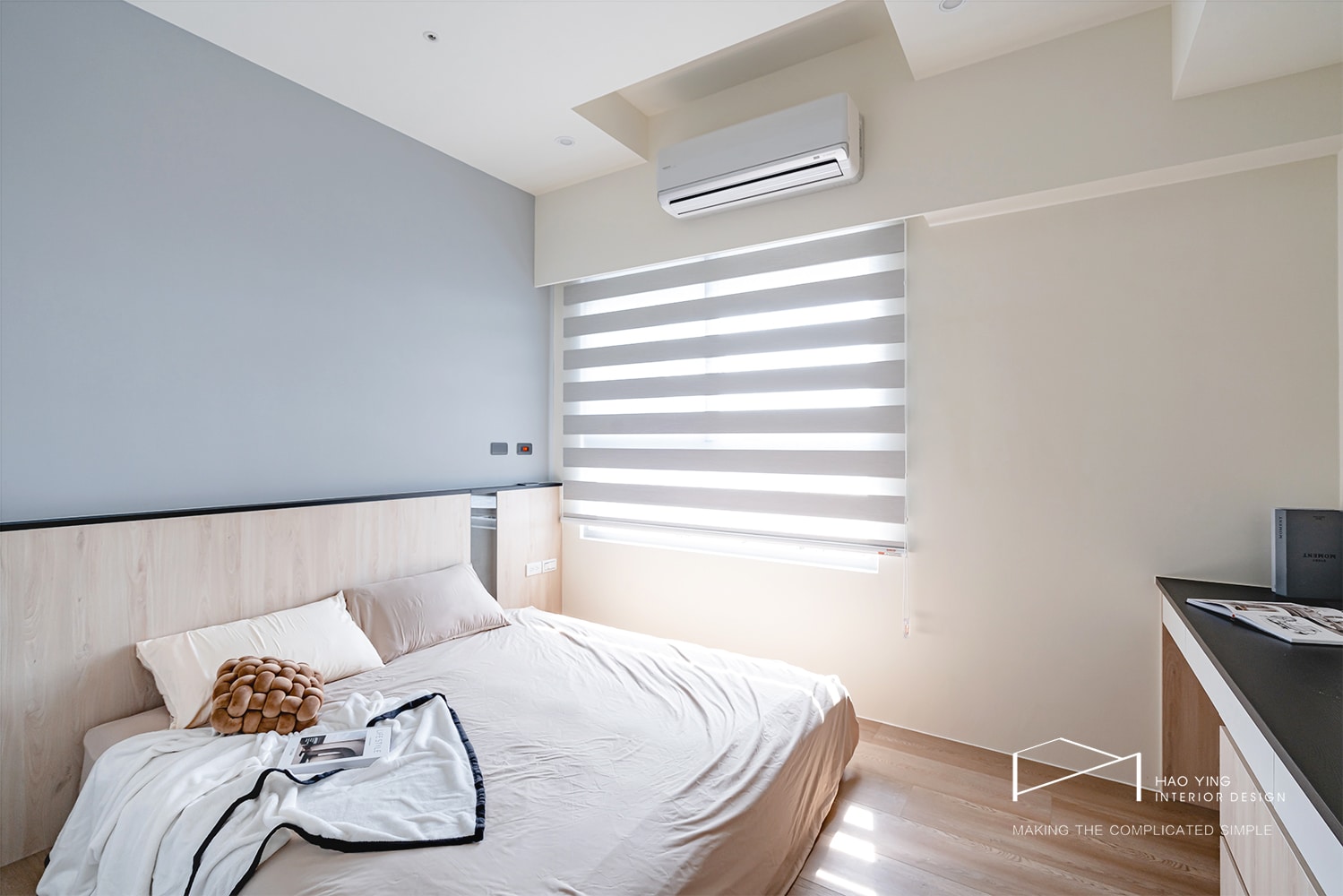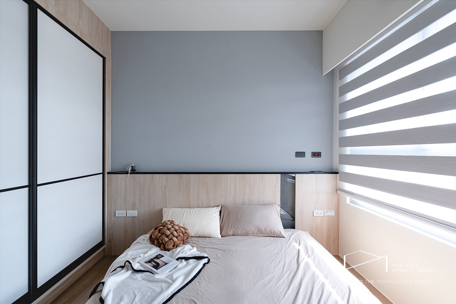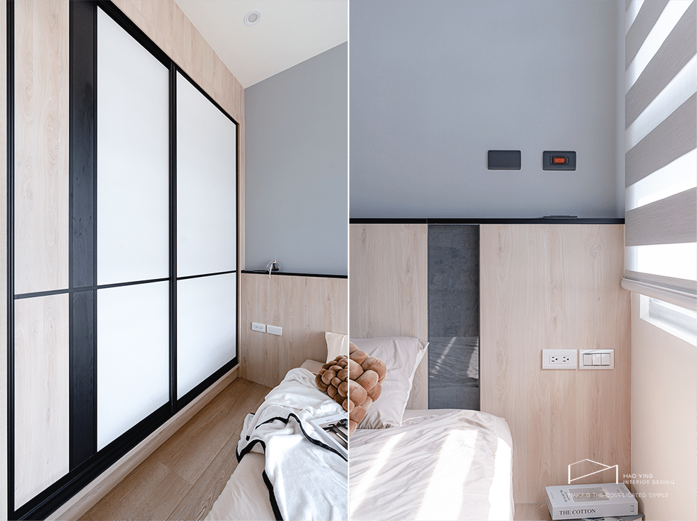 床頭以灰藍與木質拼接,呈現簡約而沉穩的調性