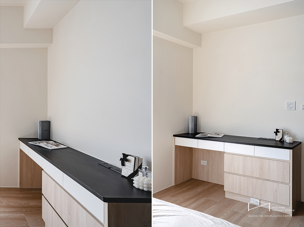 臥室角落配置長條書桌,連結生活與工作需求