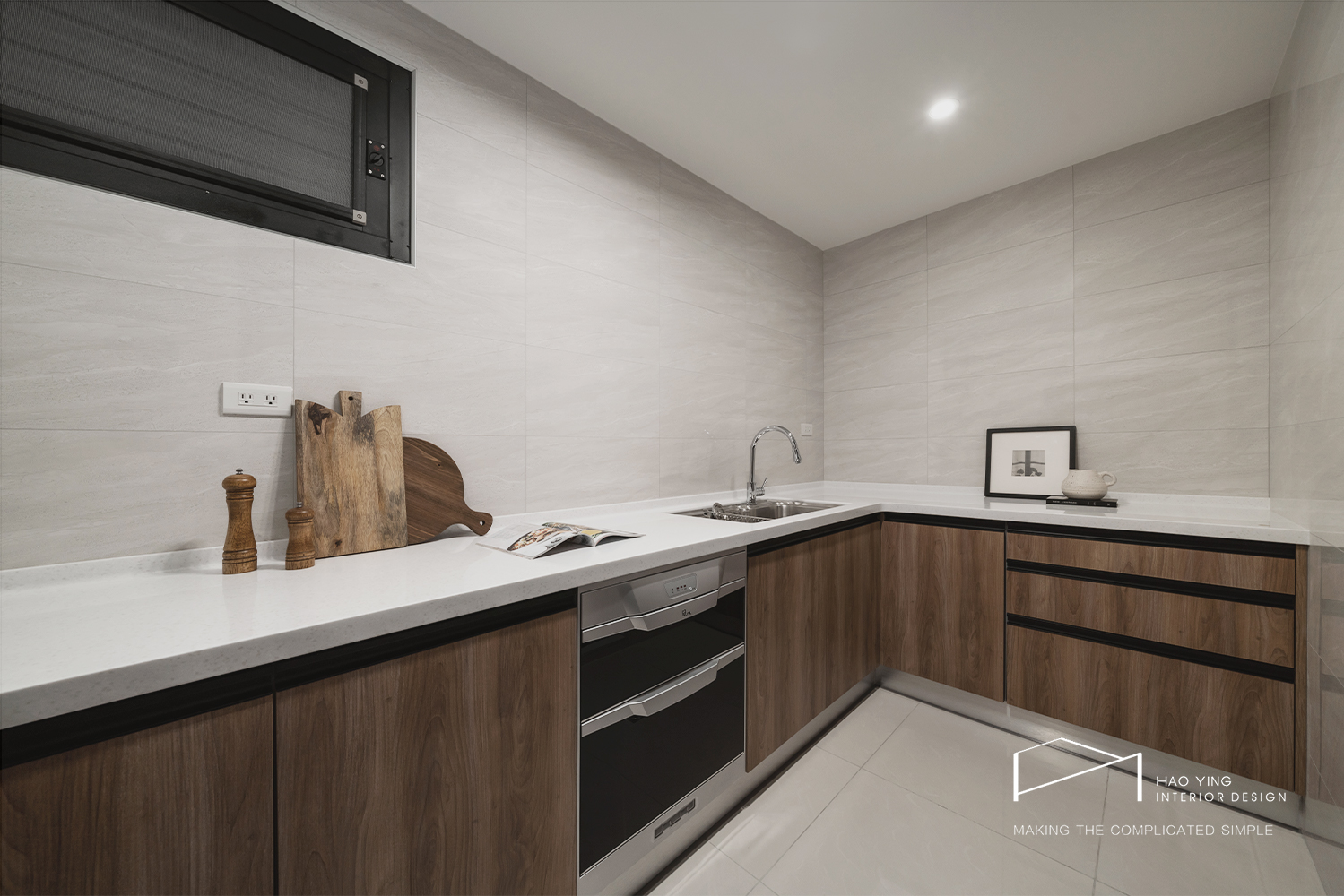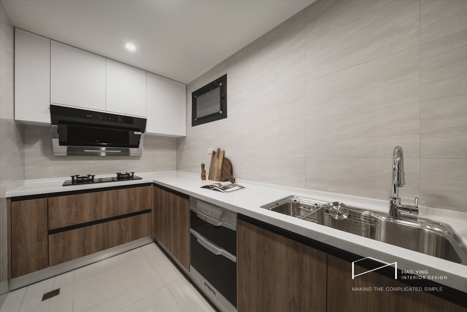 木質櫃體與白色檯面的對話,映照出純淨而沉穩的廚房氣質