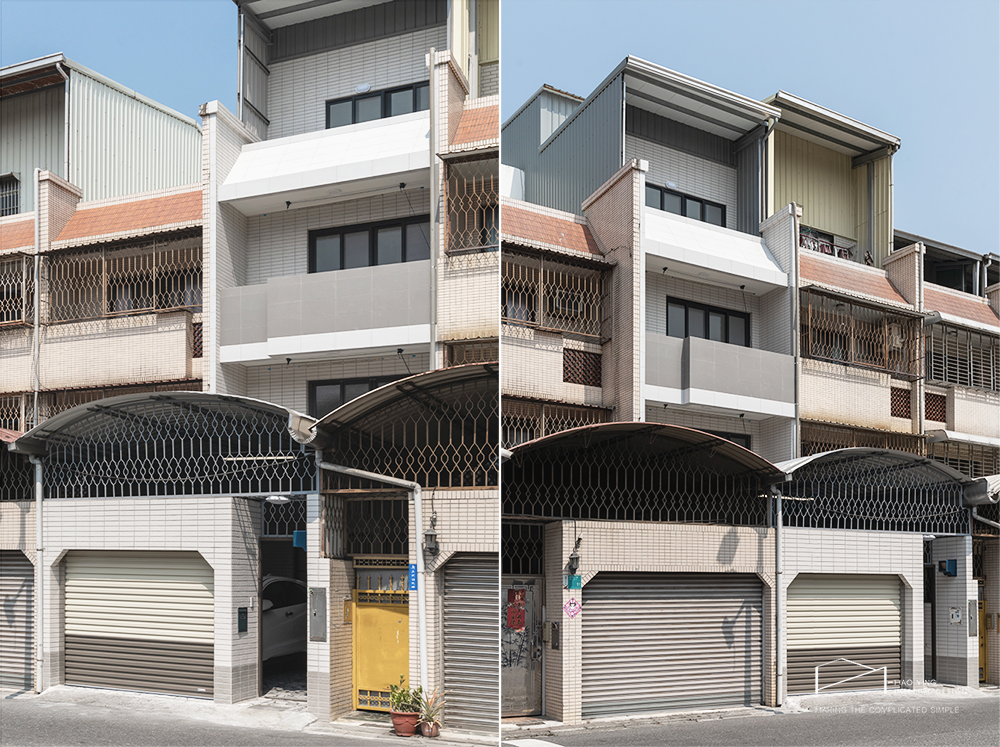 幾何拼花地坪延展層次,讓車庫入口多了設計語彙