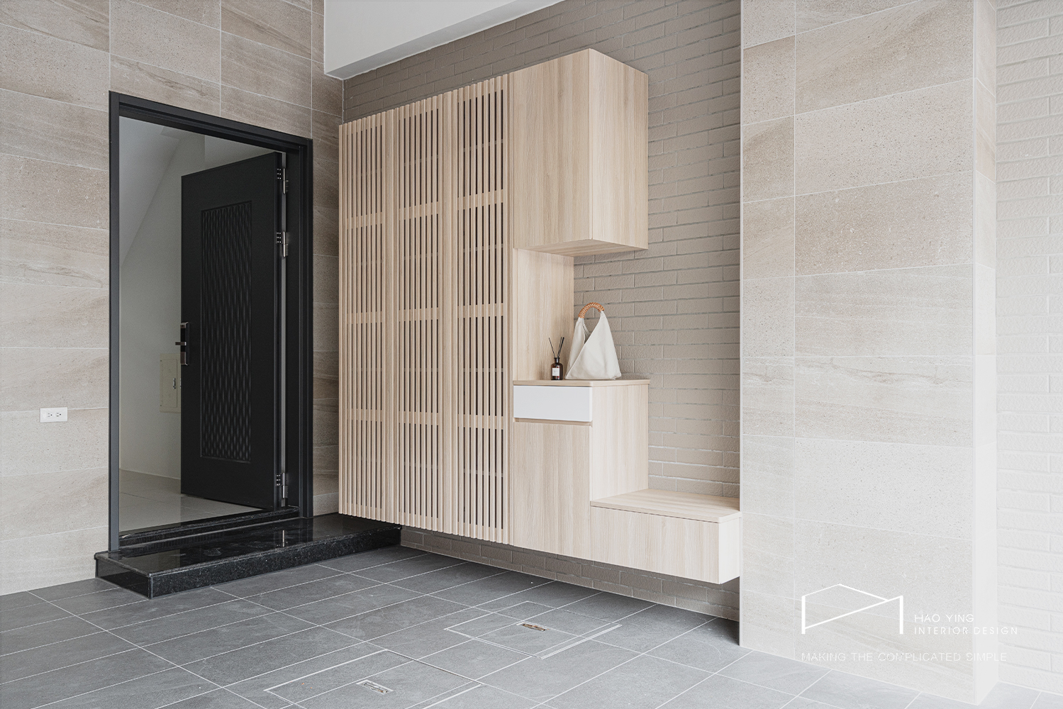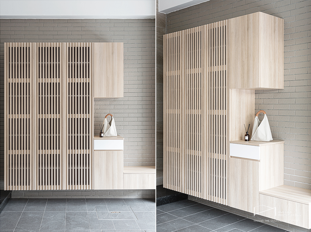抽屜與穿鞋椅貼身配置,小物井然、換鞋從容而有溫度