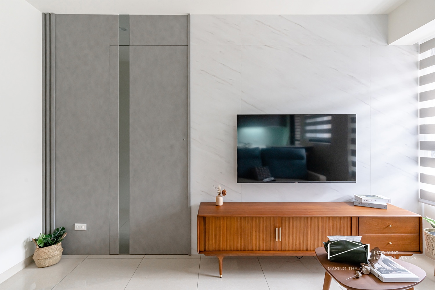 電視牆以礦石質感鋪陳,映襯出沉穩又柔和的場域表情