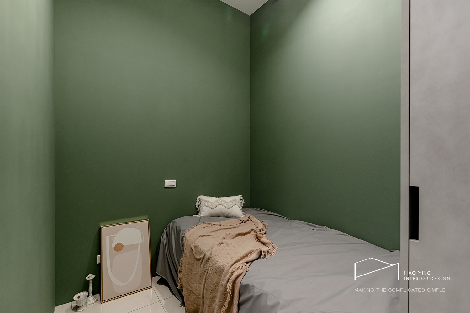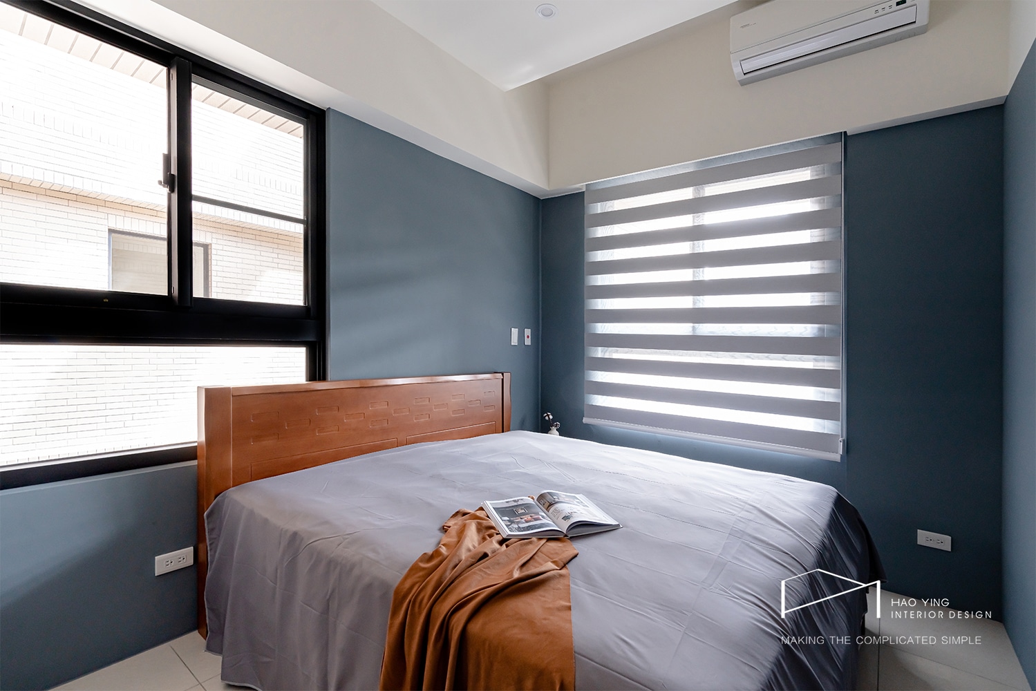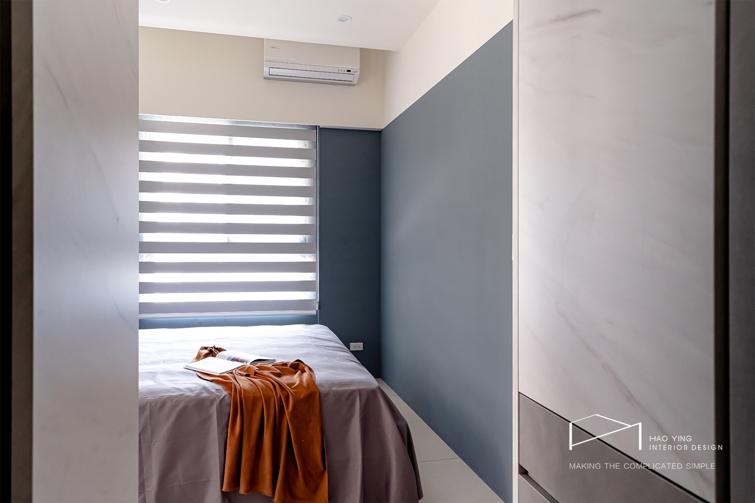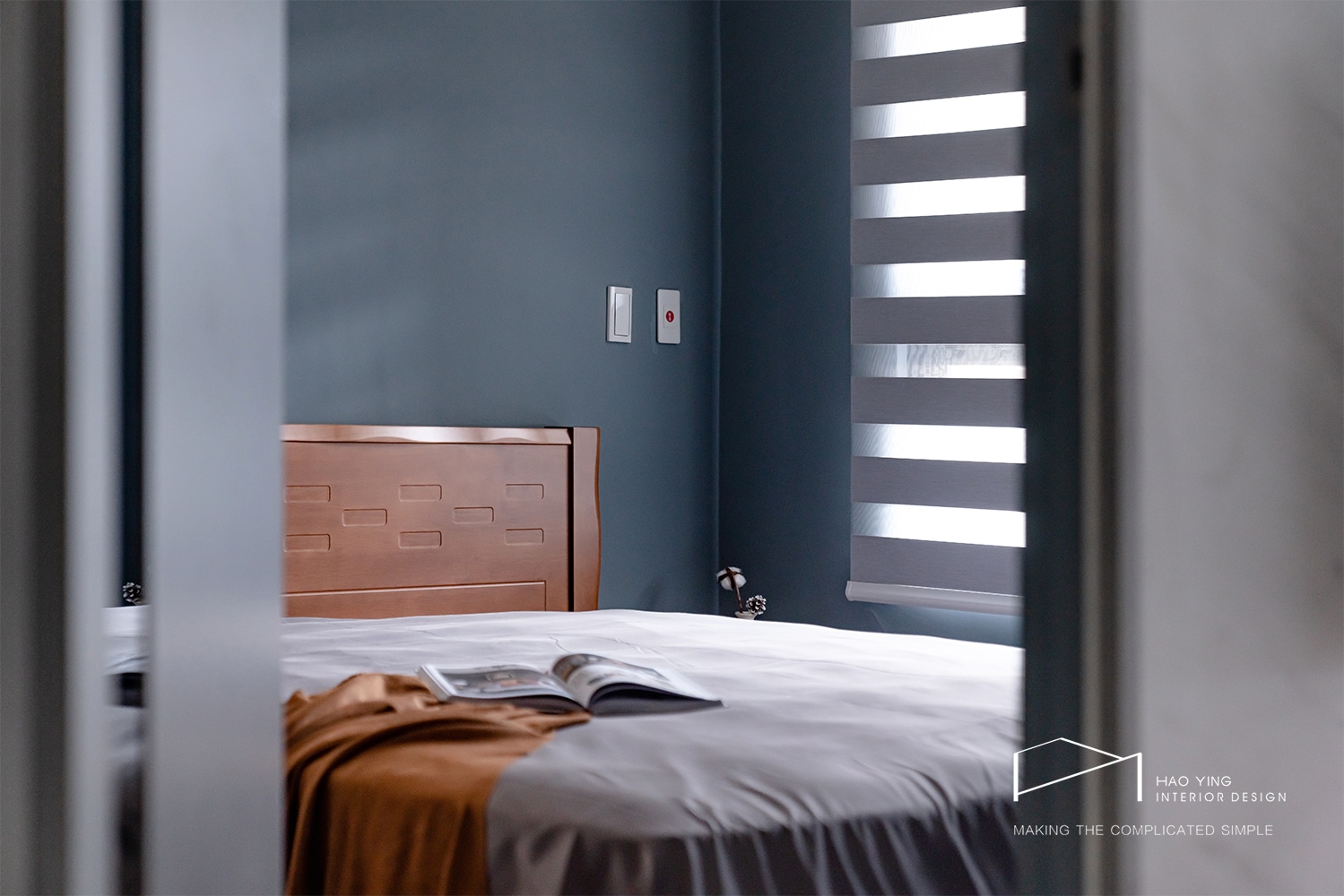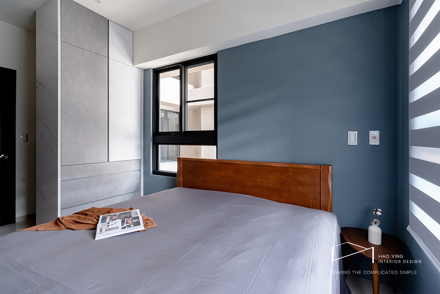 霧藍牆面包覆床頭,寧靜色調為休憩鋪陳溫度