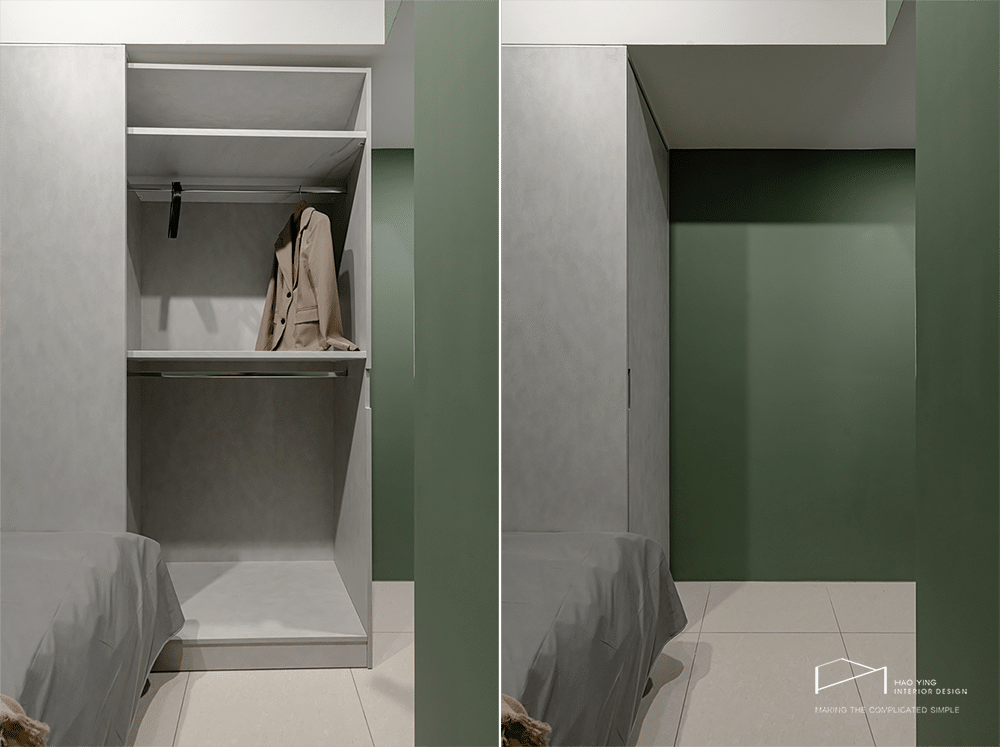 灰紋衣櫃與木質床體並置,平衡了質樸與現代的和諧調性。