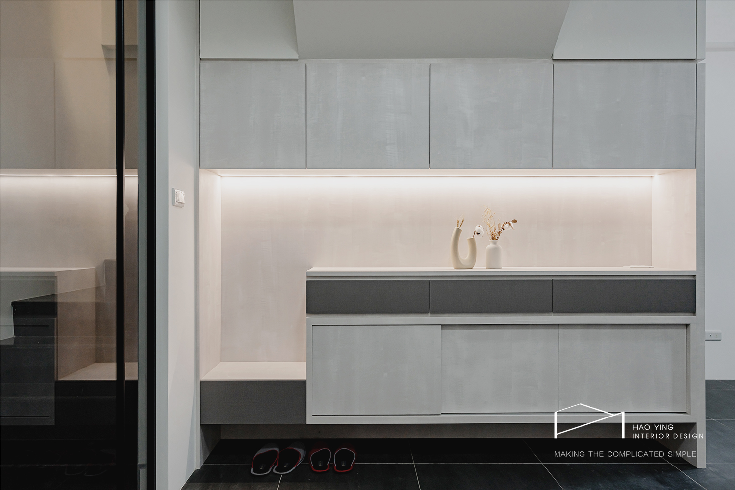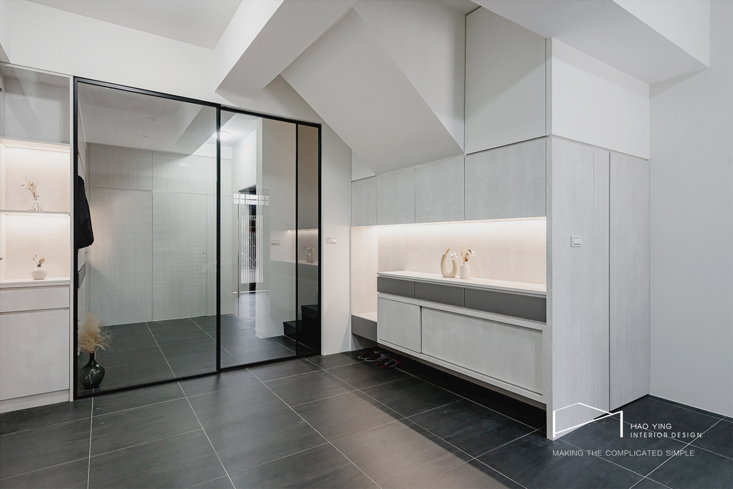玻璃拉門輕盈劃出落塵區,隔而不斷的通透設計讓視覺更延伸