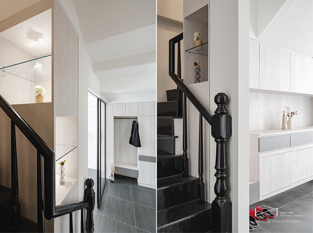 樓梯轉角設置展示櫃,光影倒映出細膩的生活表情