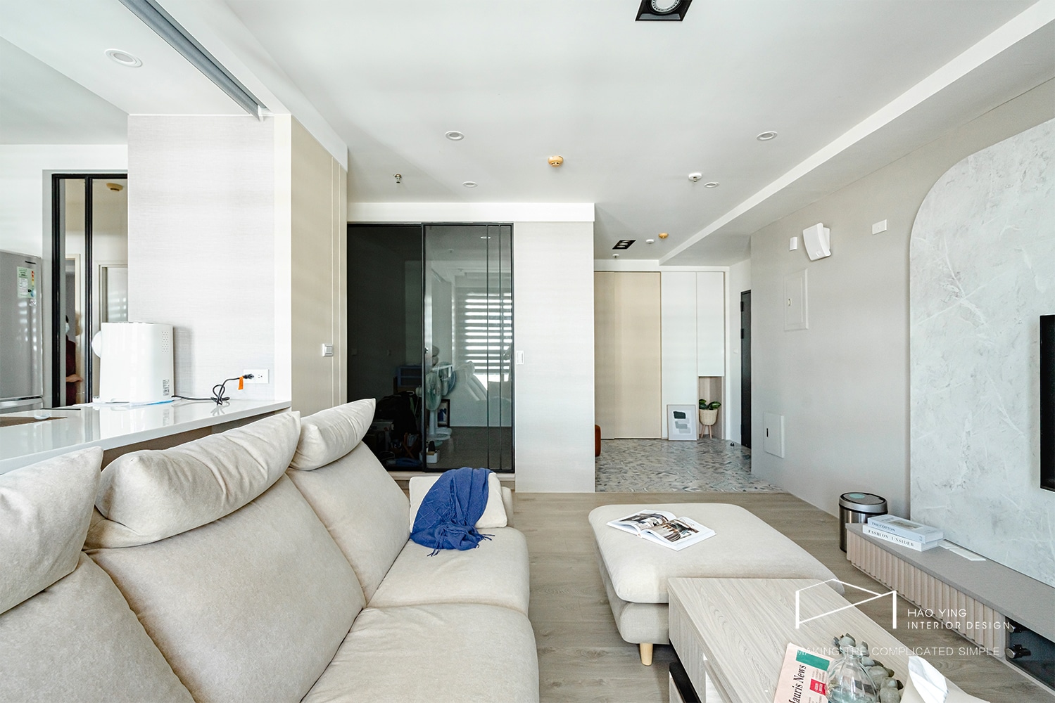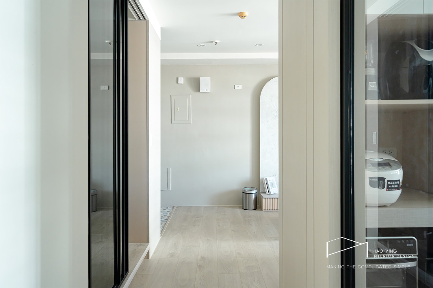 大面收納櫃體隱於淺木與白色調之間