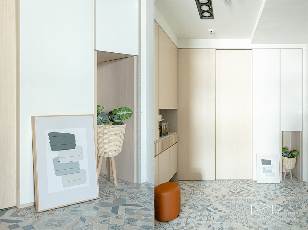 懸空鞋櫃與綠意點綴,迎接柔和回家氛圍