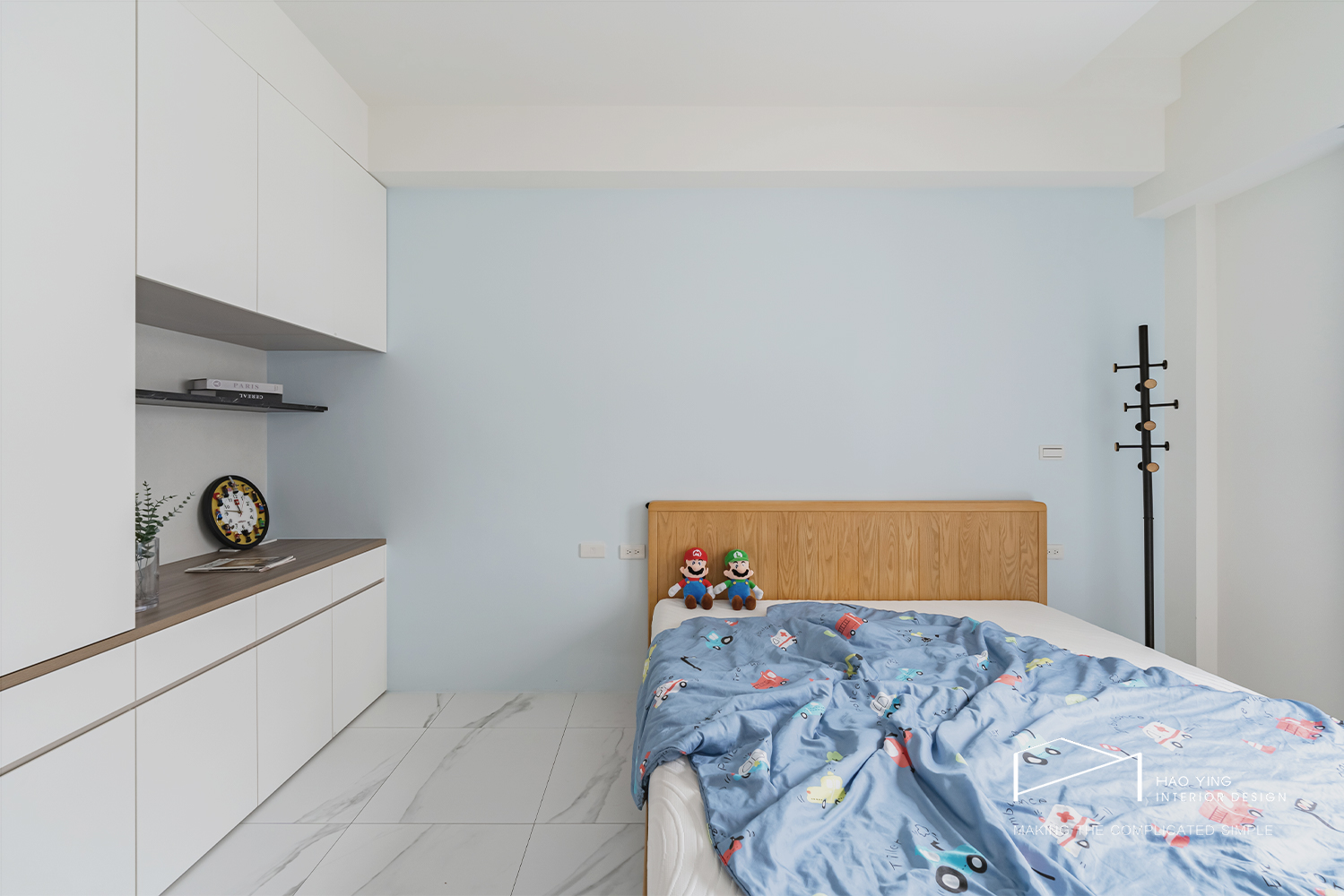 溫潤搭配淡藍牆面,營造明亮而安心的休憩氛圍