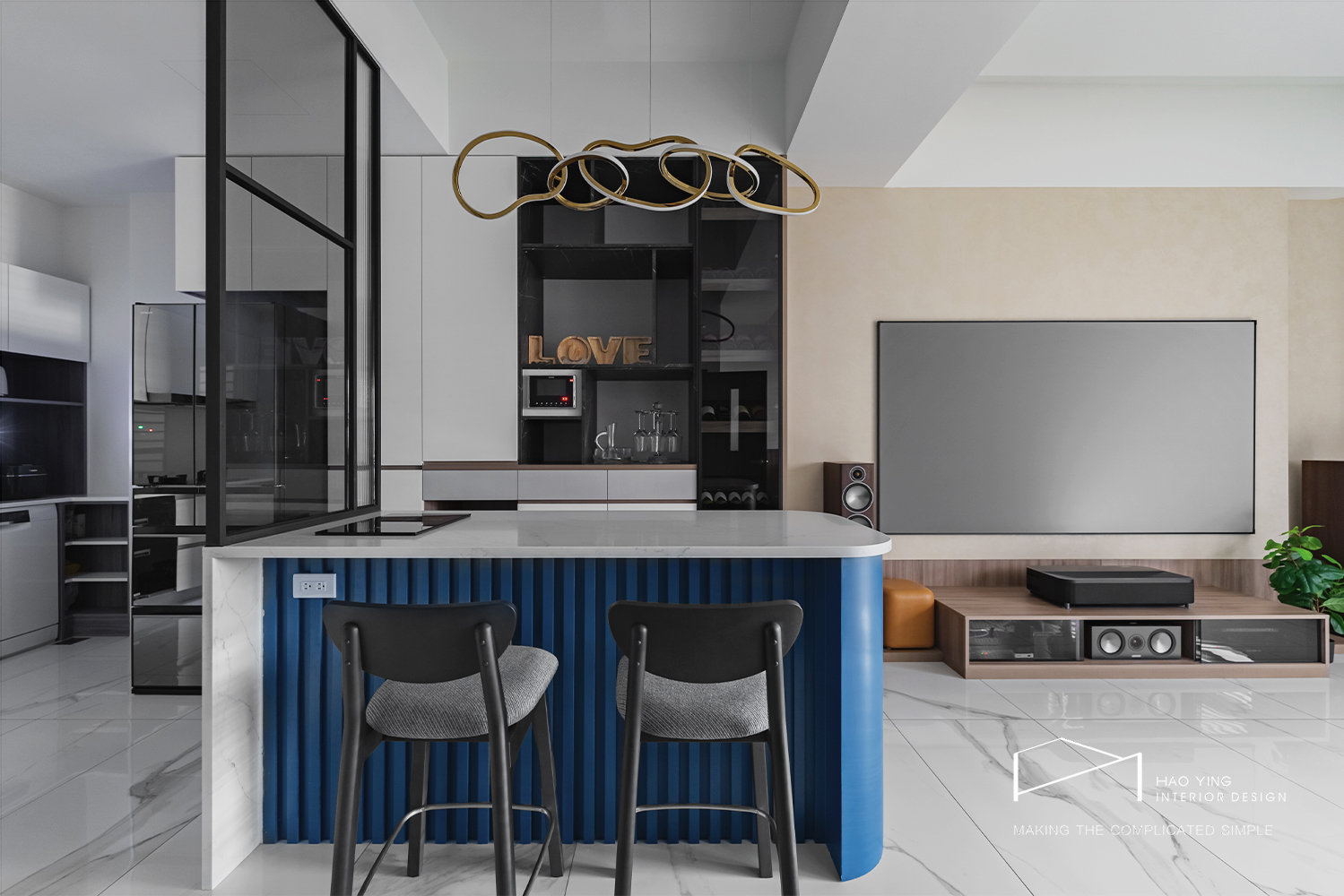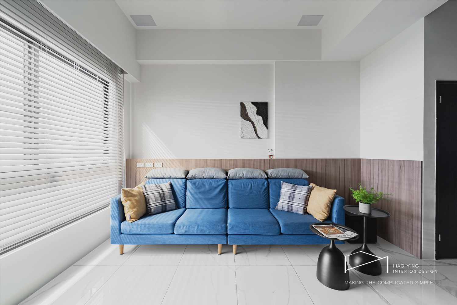 藍色沙發跳色其中,讓客廳多了一份藝術張力