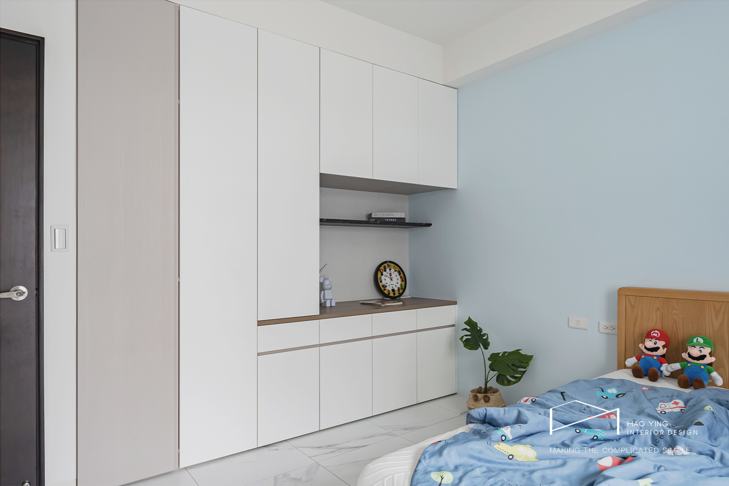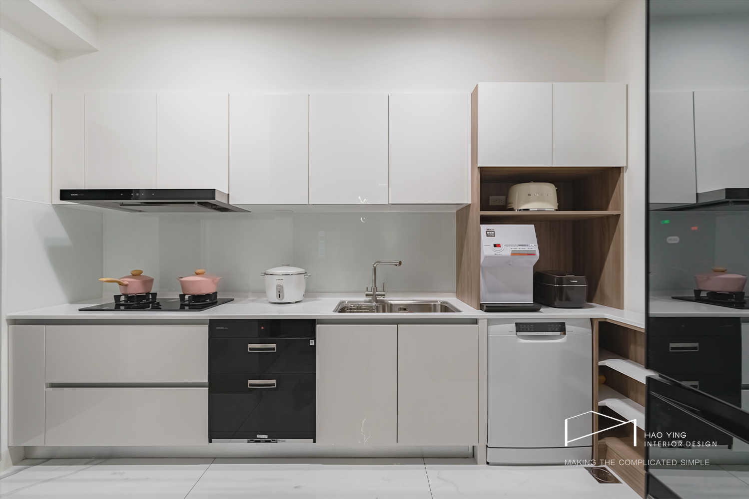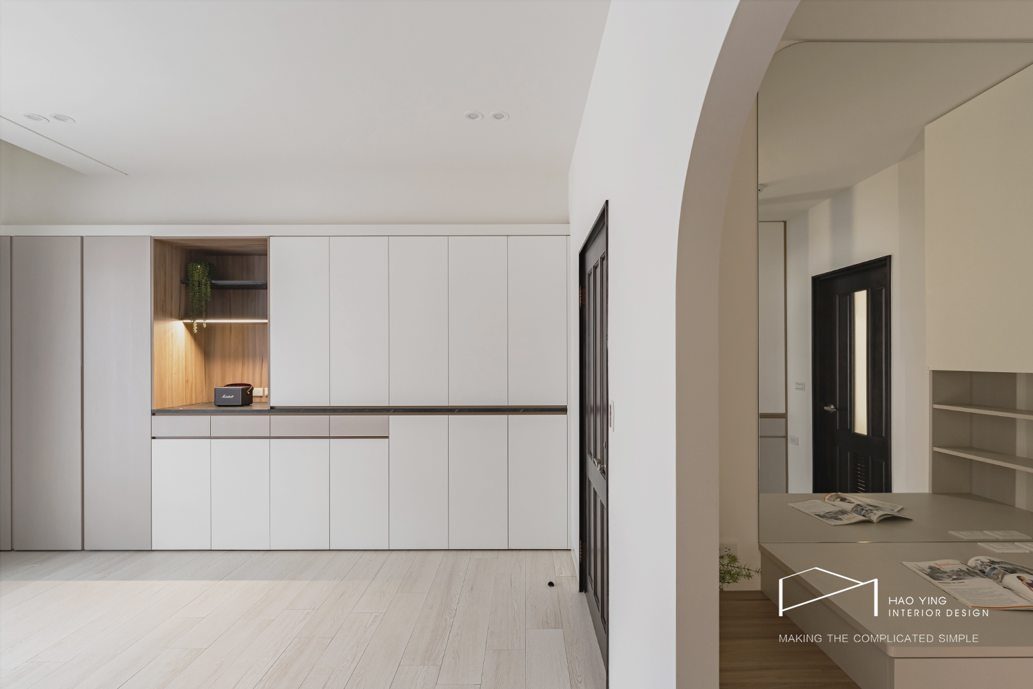 潔白櫃體延展開來,讓空間更顯純淨俐落